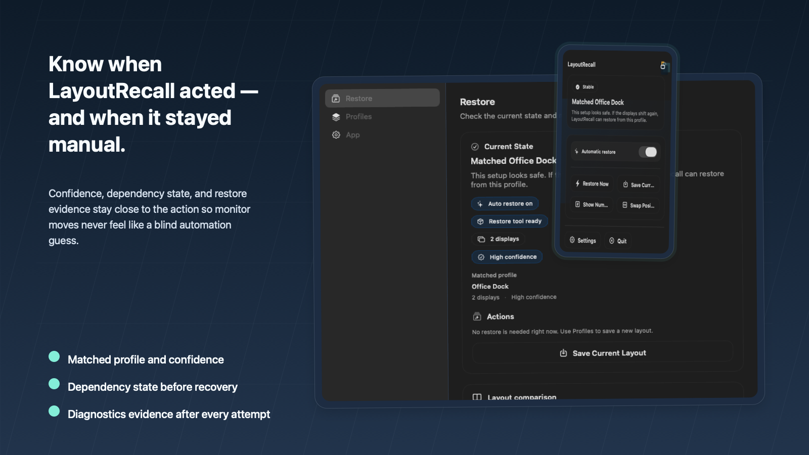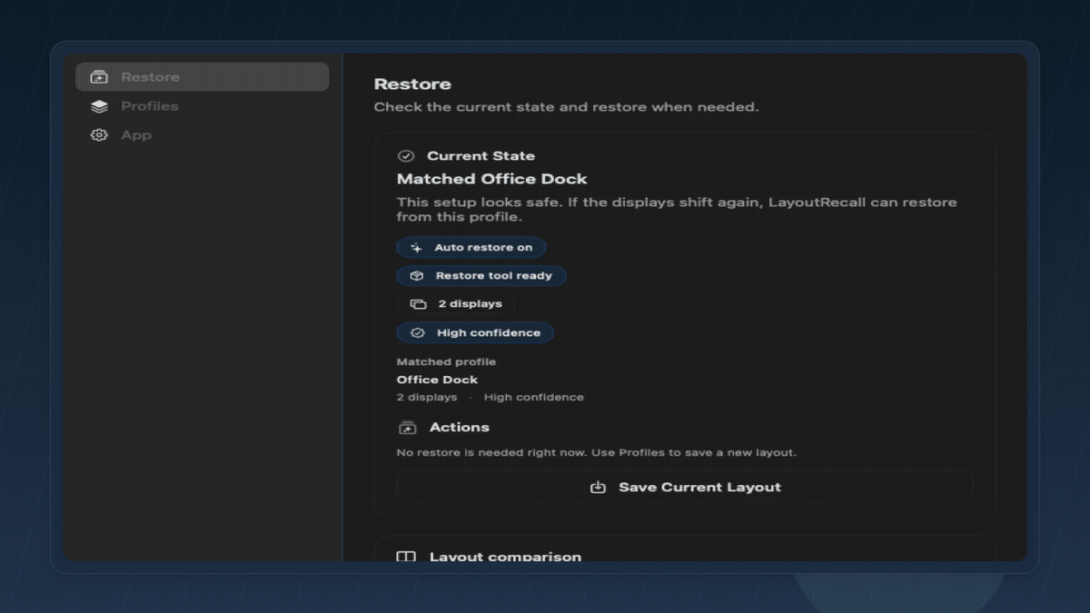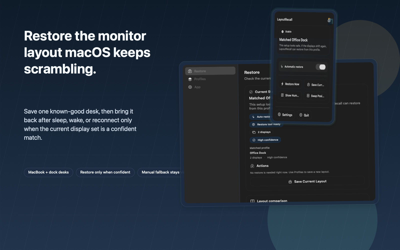 LayoutRecall is most convincing when you already have a known-good desk layout and want a safer way to recover it after macOS drifts.