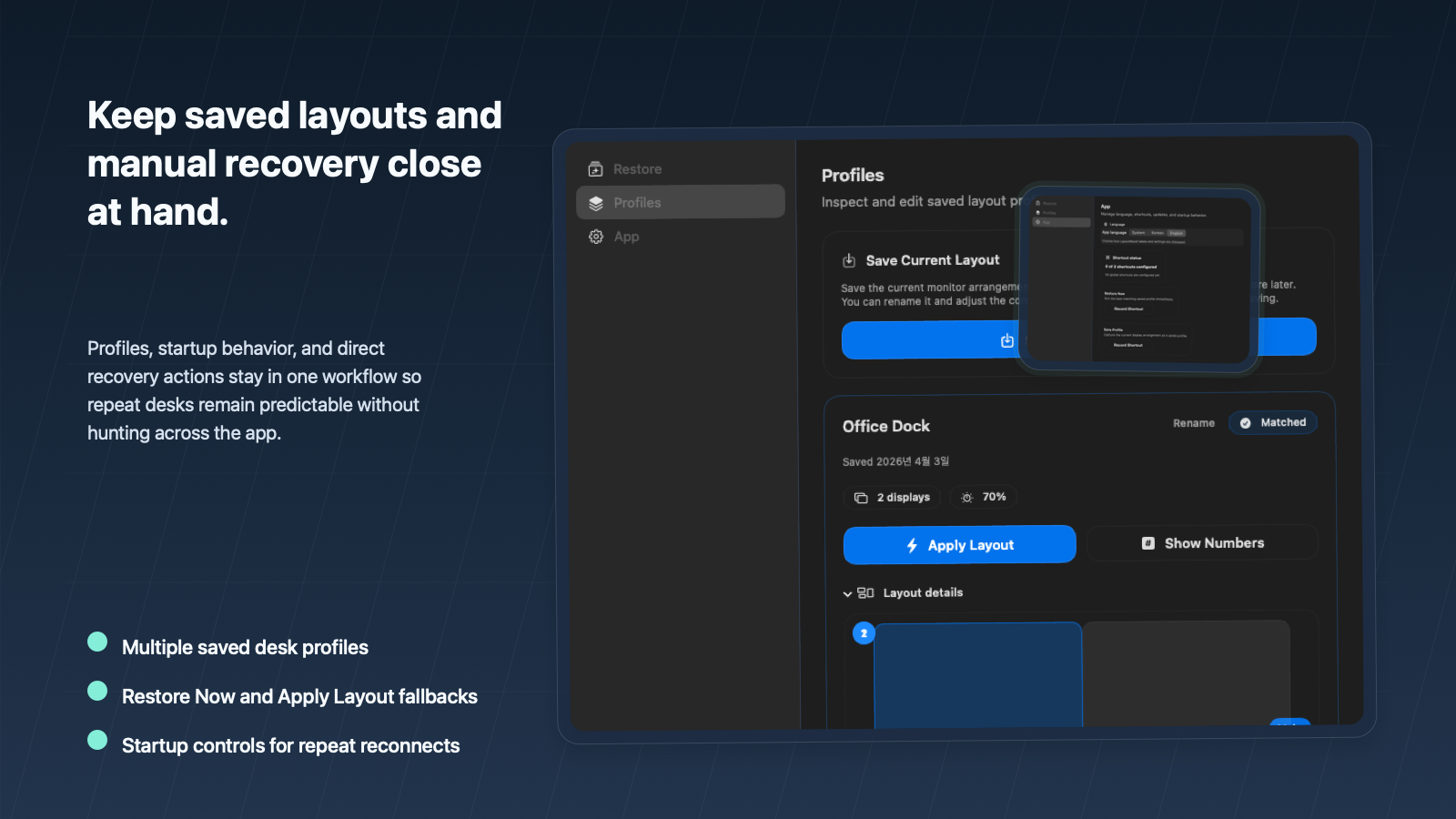 The app is intentionally narrow: restore a desk you already trust instead of pretending to be a full display-management suite.